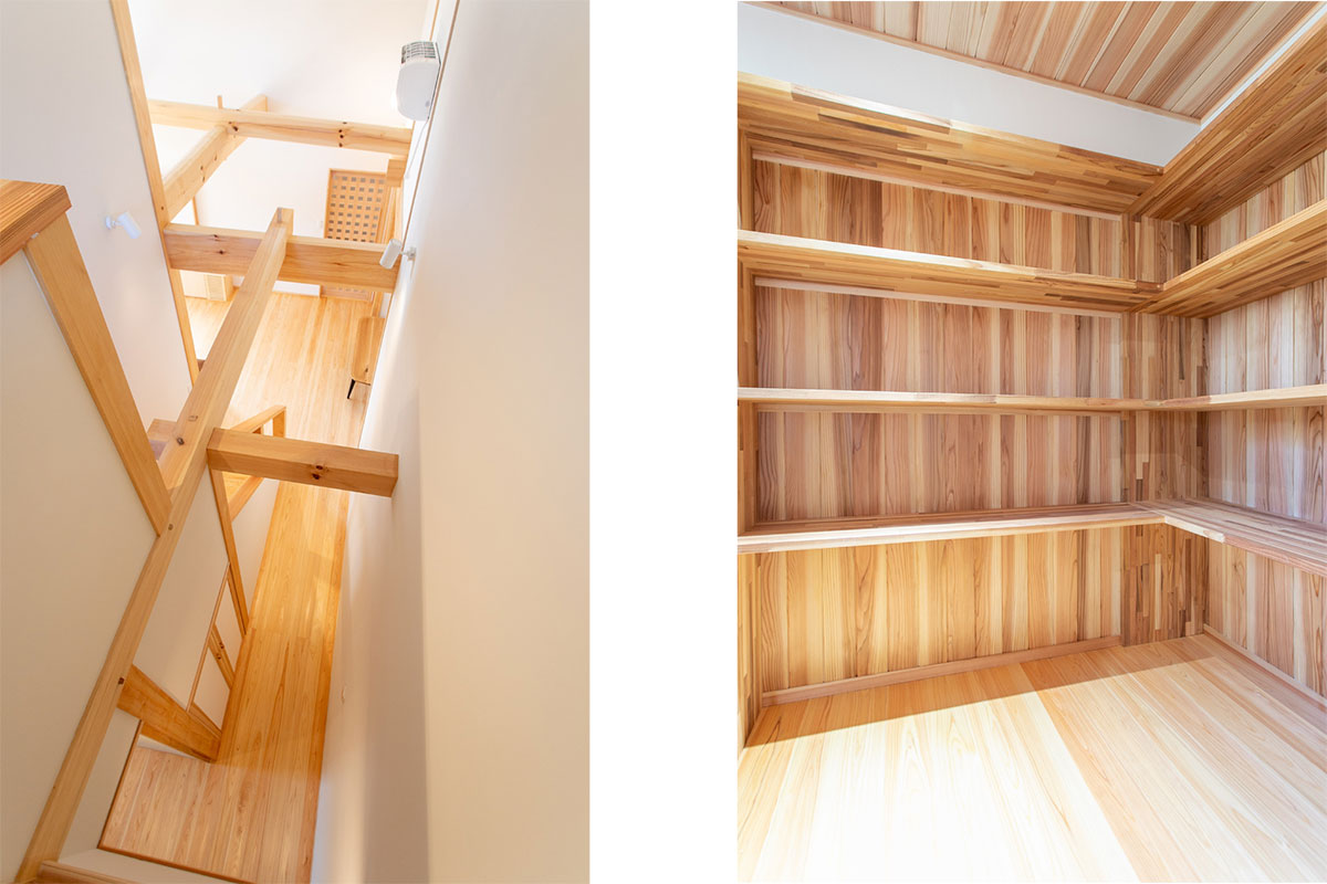 伝統の日本家屋の技術をバックボーンに、天然素材をふんだんに使った#自然派住宅。酒井工務店の考える#新しい日本家屋のショーケースです。設計は同じ鹿沼市のモード設計事務所。内装にはリックス工業株式会社の施工による漆喰壁とし、構造材をあらわとした「木組みあらわし」による吹き抜けのある広々としたリビングダイニングが特徴です。このリビングダイニングは大空間にもかかわらず、温もりある無垢板張りや調湿効果のある漆喰壁、さらに適切な断熱・気流設計が相まって、一基のシーリングファンと一台のエアコンのみで、四季を通じて健康的で快適な室内環境を作り出しています。